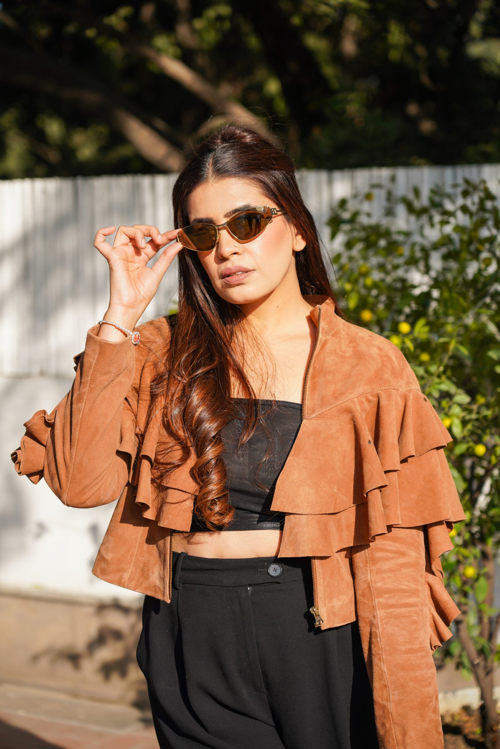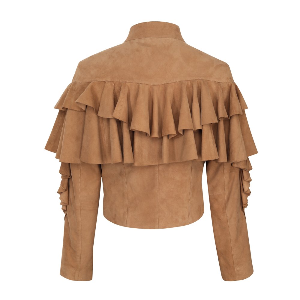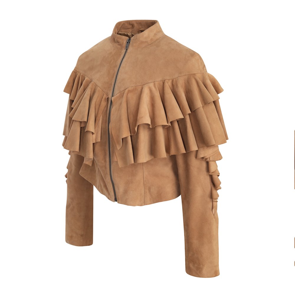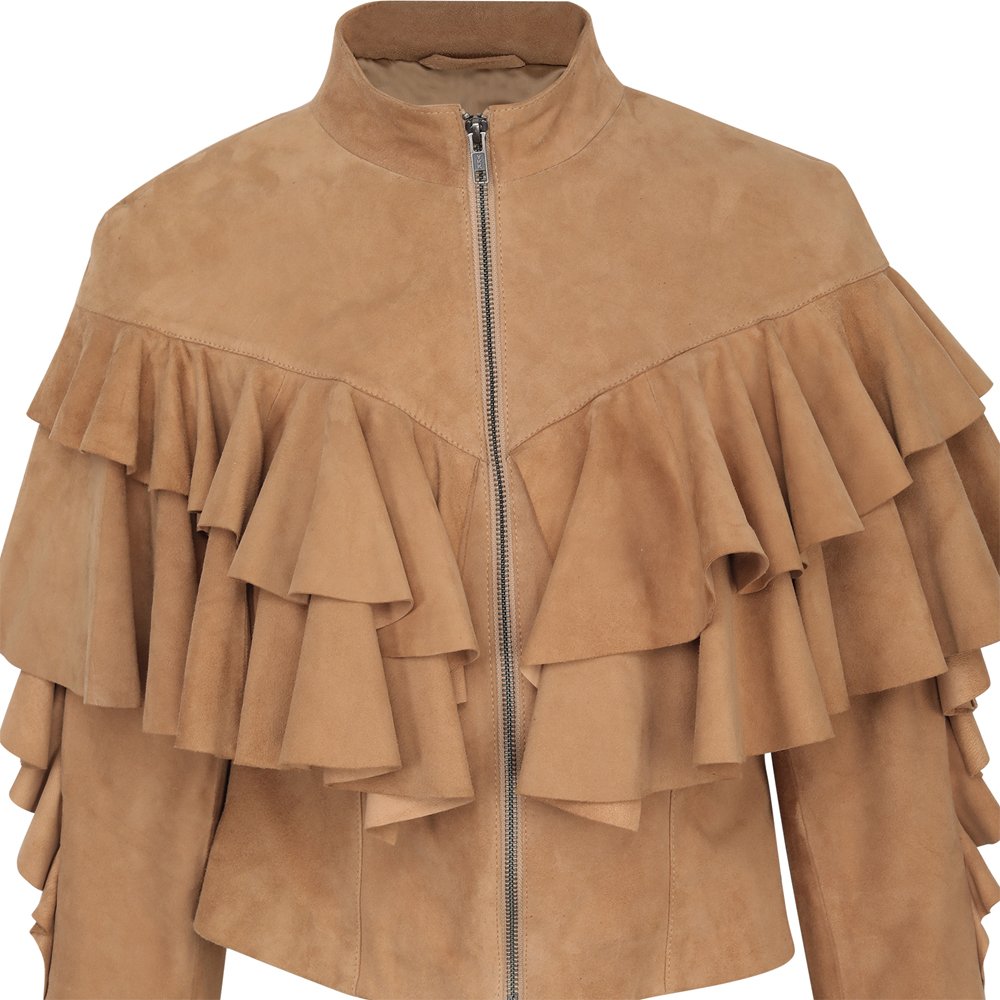 Soft and velvety touch suede, fitted, ruffled leather, centre front zip, fine stitching,
