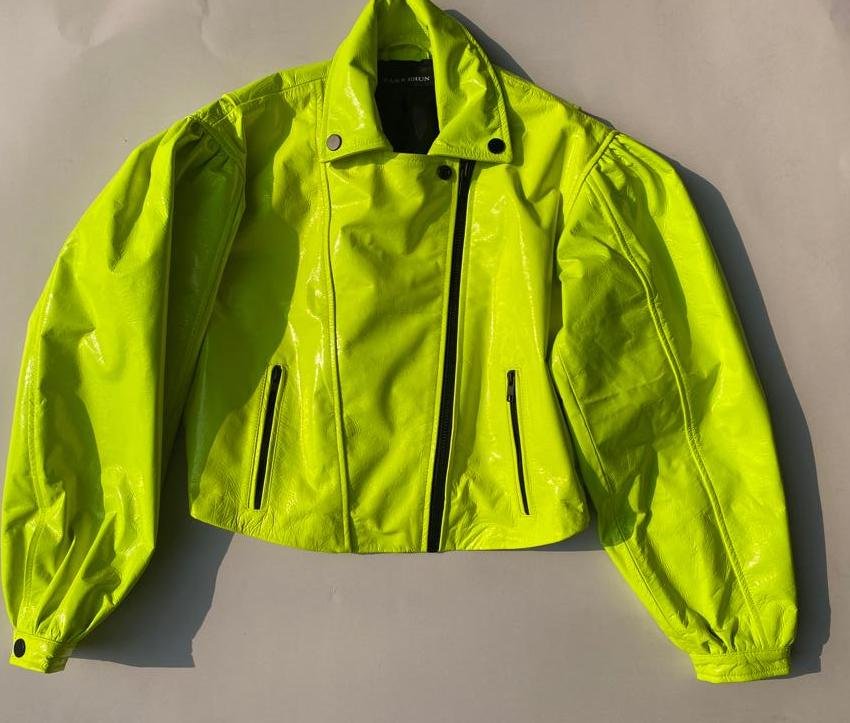 Soft and velvety touch sheep leather over-sized jacket, balloon sleeves, biker look collar,two zipper pockets on waist, snap button closures on collar & lapel, nickel finish zippers