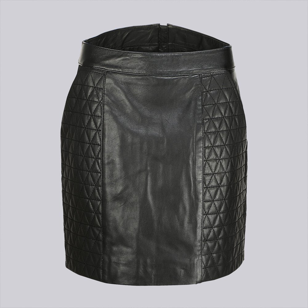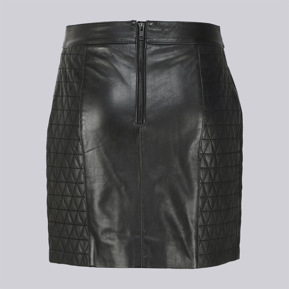 Napa leather skirt, easy inserted packet, designed with quilting on front side & back side panels with light padding, metal zipper opening on centre back, lined with polyester fabric.