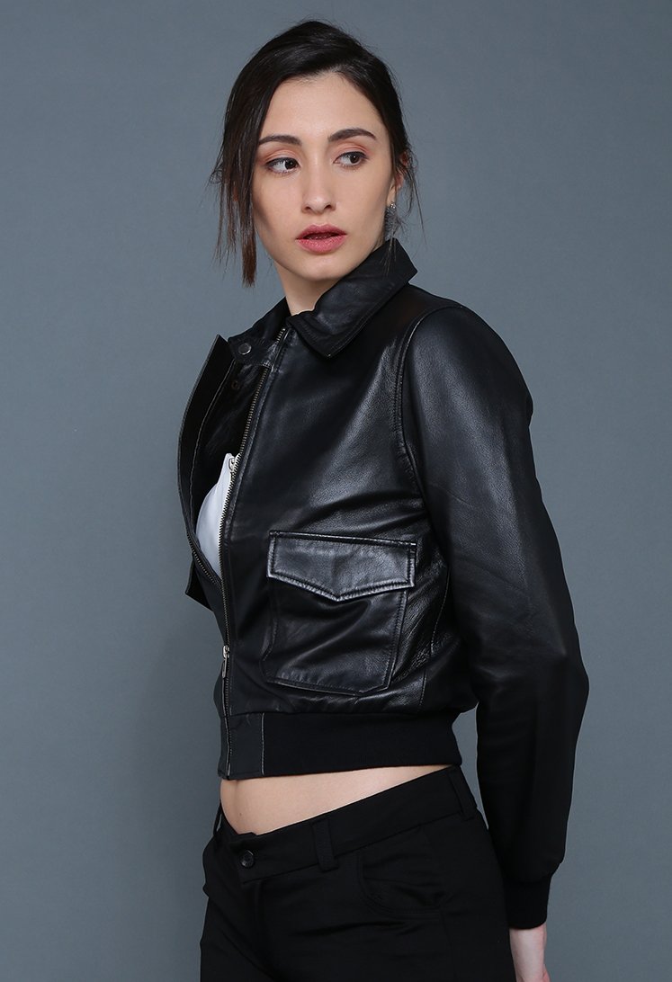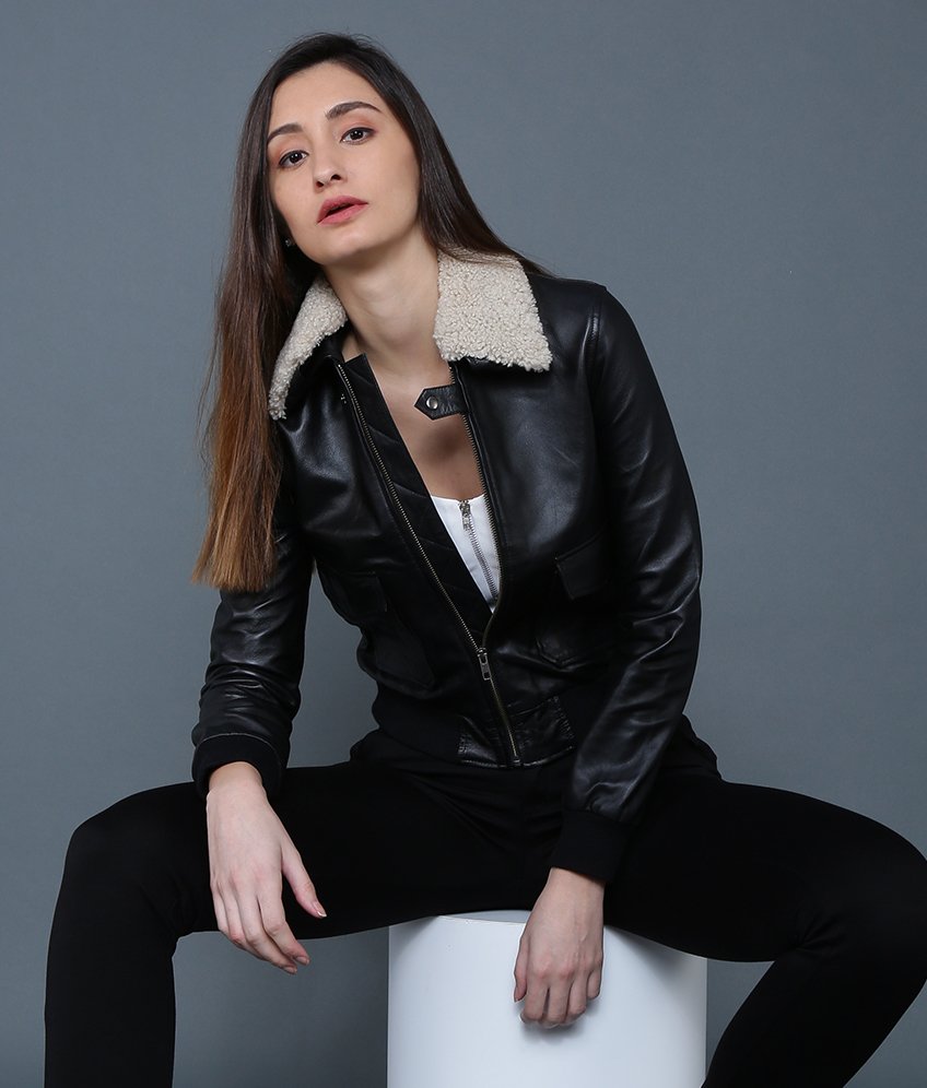 Leather soft to touch and of superior quality, detachable fur collar, zipper closure in front, two flap pockets on the front, ribbed cuffs & bottom, snap closure on the collar, long sleeves, fine stitching.
