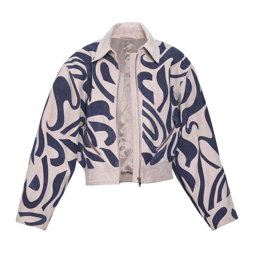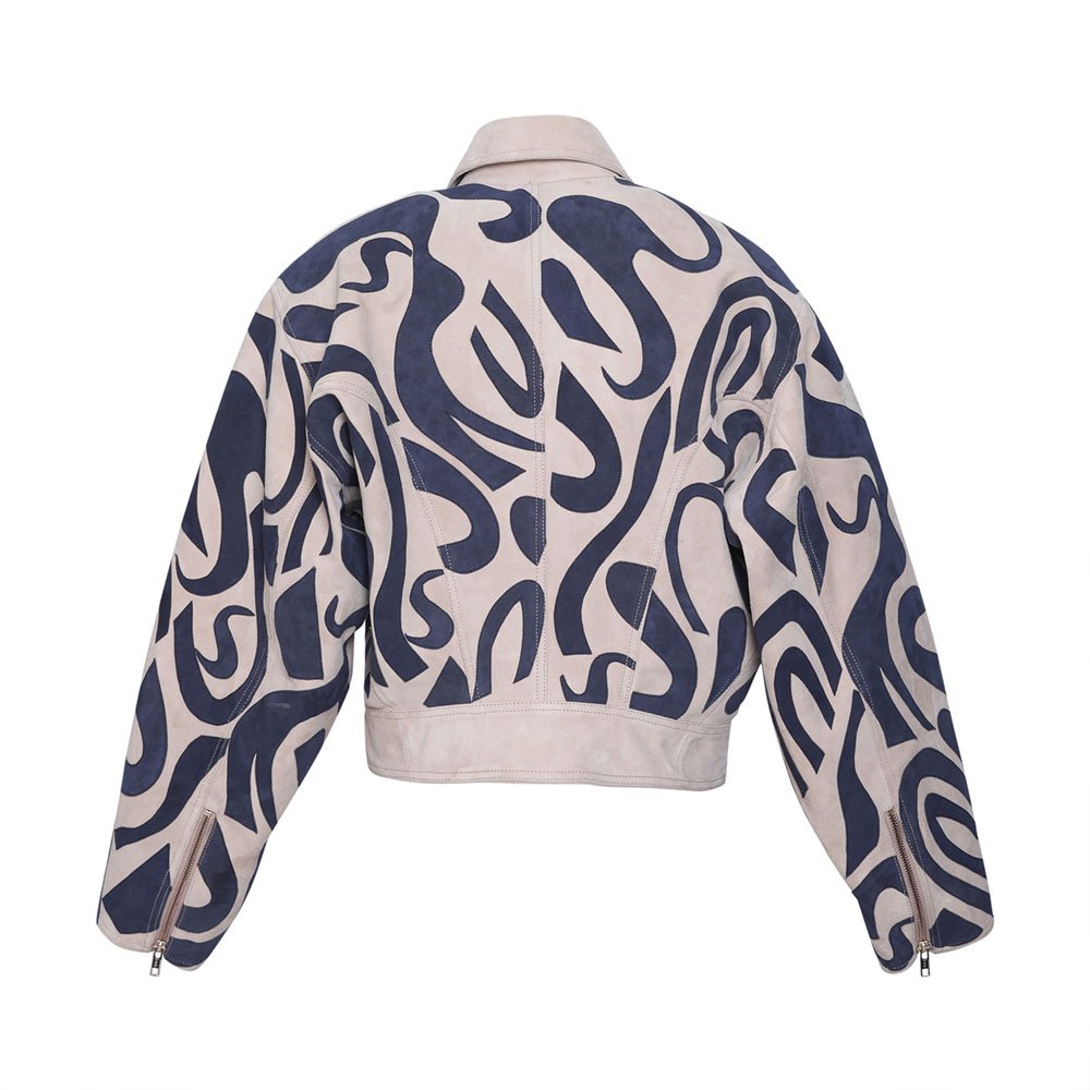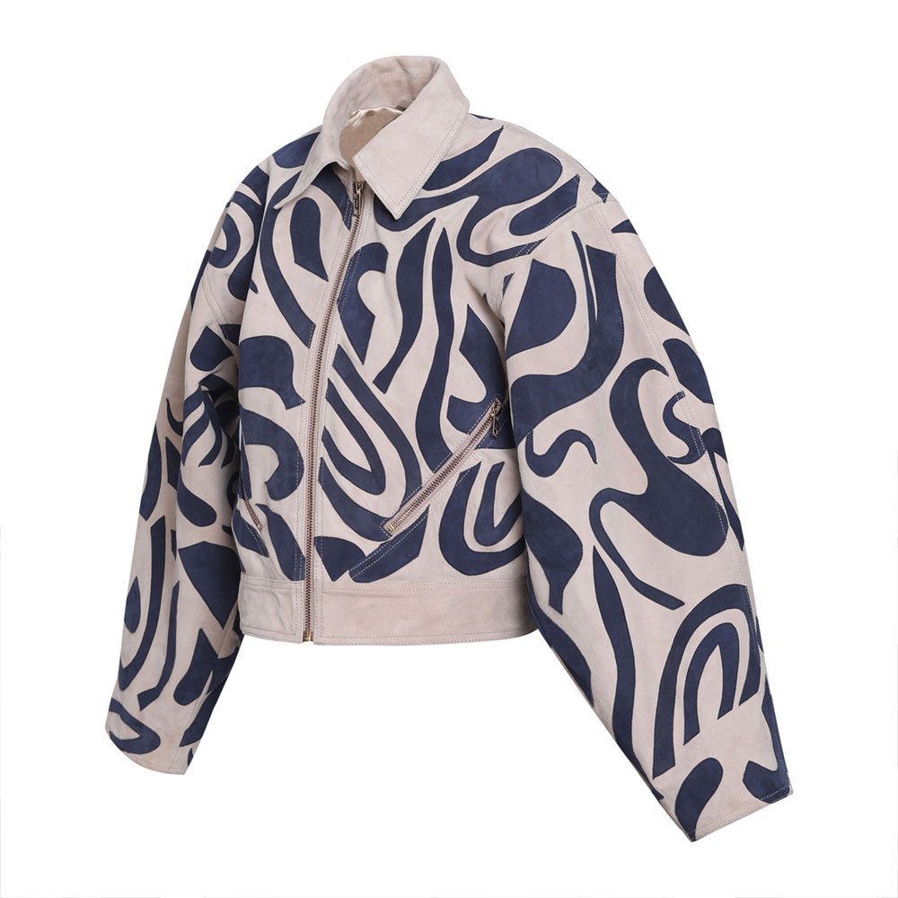 Soft and velvety touch suede, appliqué, patchwork, cropped, lined, two front zips, fine stitching