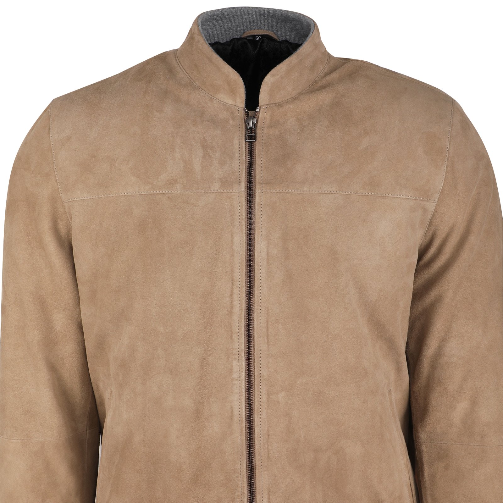 Leather soft to touch and of superior quality, ribbed hem, neckline and cuffs, front zip, two pockets on sides, baggy fit