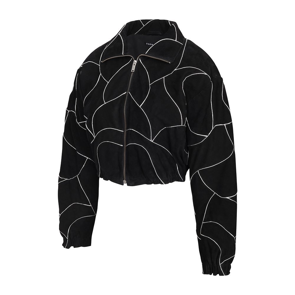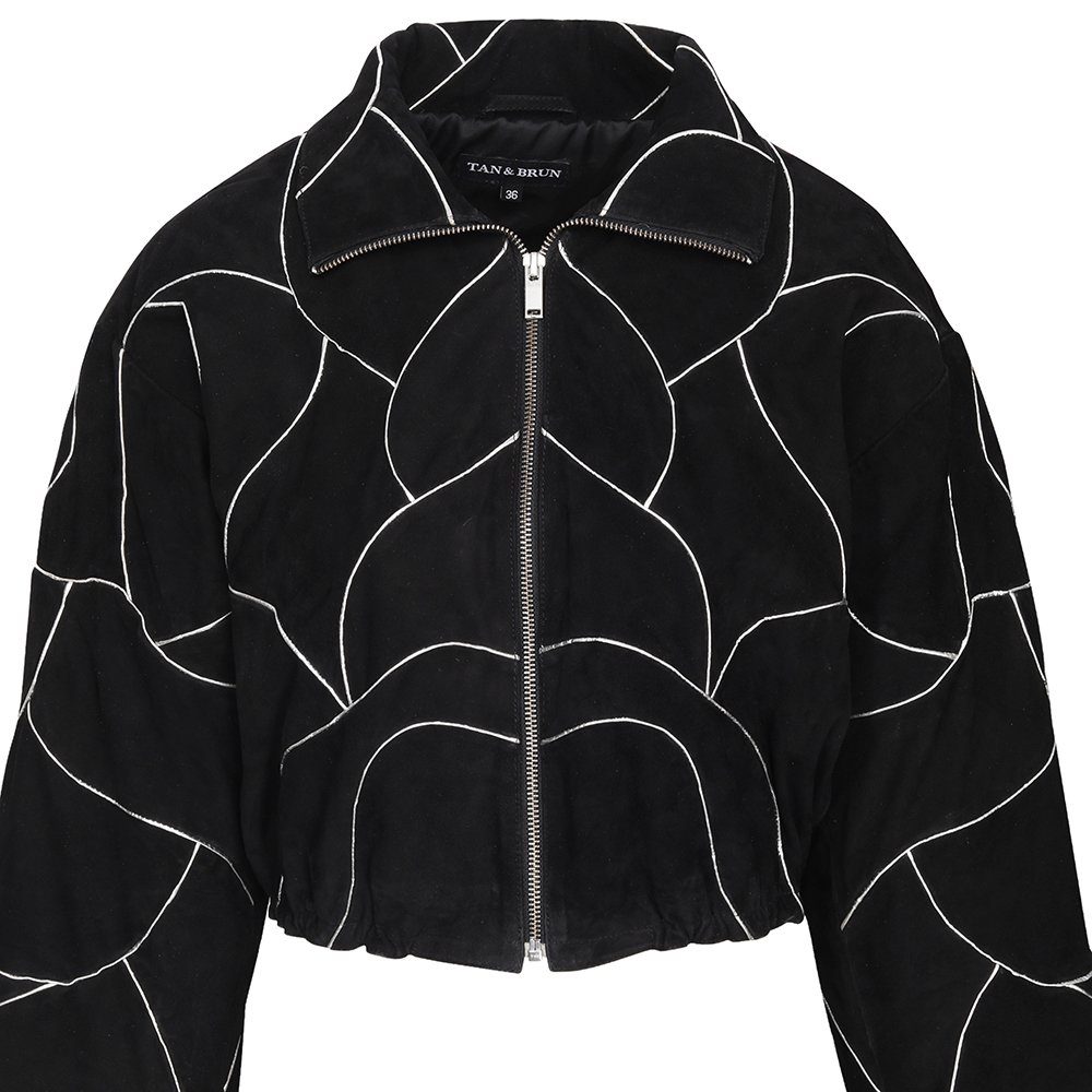 Soft and velvety touch suede, handwork patchwork, fine stitching, bomber, polyfilled, piping, foiled leather, centre front zip, elastic waist